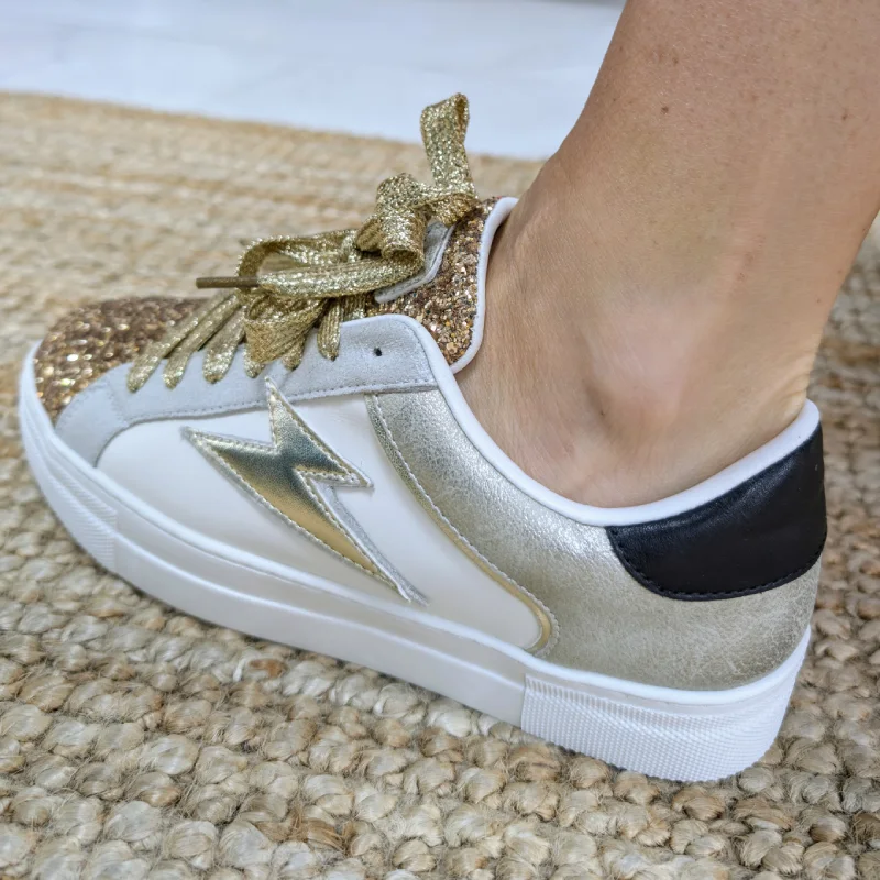 Un détail remarquable est l’éclair doré sur l’un des côtés, qui ajoute une note moderne et audacieuse. L’arrière de la chaussure présente une couleur dorée marbrée, tandis que le haut du talon est noir, créant un contraste élégant. Ces baskets sont idéales pour celles qui souhaitent allier confort et sophistication, tout en se démarquant par leur style unique.
