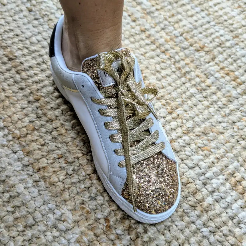 La première paire de baskets se distingue par sa couleur blanche éclatante. Elle est sublimée par des détails en strass dorés qui ajoutent une touche de glamour. Les côtés, le bout et la languette sont entièrement recouverts de strass, créant un effet scintillant à chaque pas. Les lacets dorés et pailletés apportent une dimension supplémentaire à cette chaussure, faisant d’elle le choix parfait pour une sortie en soirée ou un événement spécial.