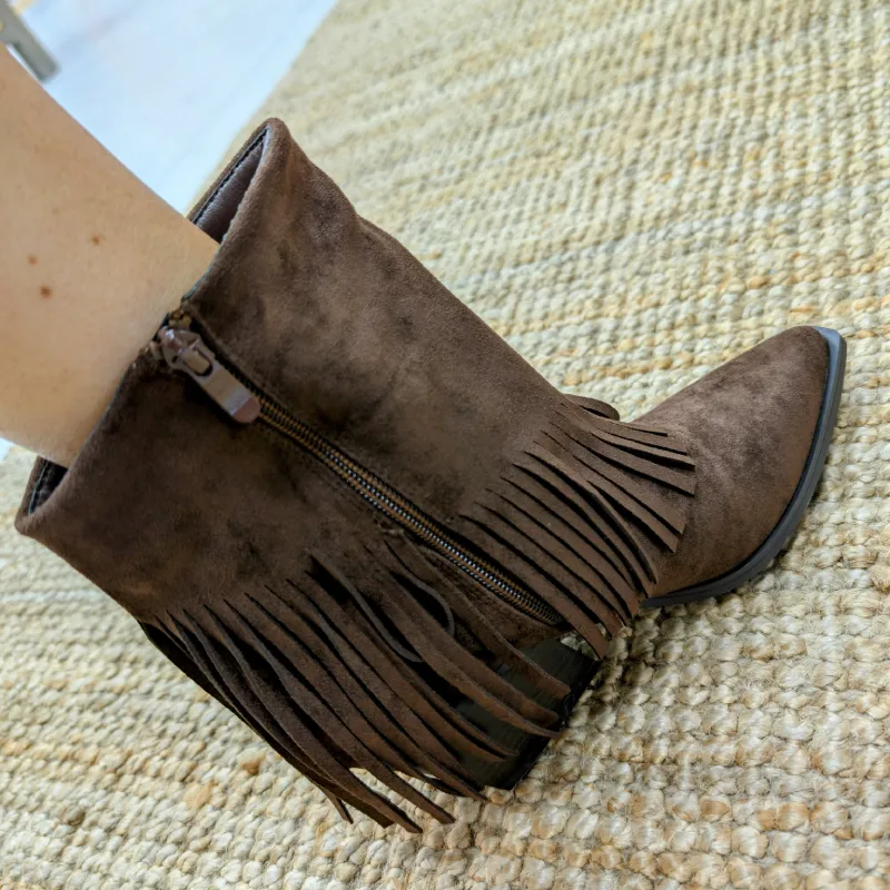 La fermeture éclair sur le côté des bottines facilite leur enfilage et leur retrait, rendant ces chaussures pratiques pour un usage quotidien. Plus besoin de lutter avec des lacets ou des fermetures compliquées : il vous suffit de glisser vos pieds à l’intérieur et vous êtes prête à partir. De plus, ces bottines sont recouvertes de franges, ajoutant une touche de dynamisme et de caractère à votre look. Les franges se balancent avec chaque pas, apportant une note de mouvement qui attire l’œil.