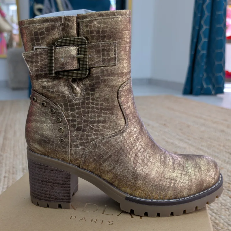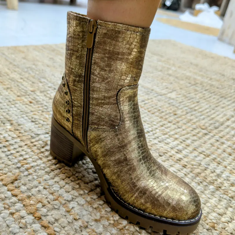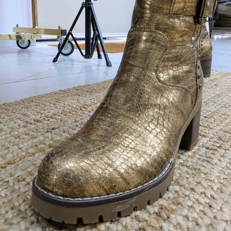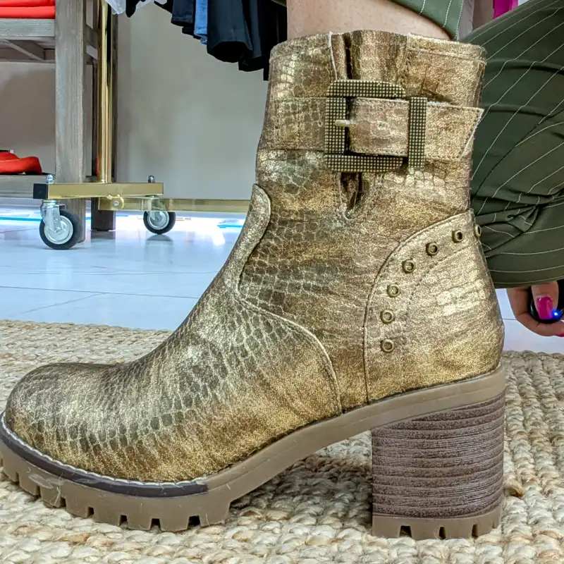 L’imprimé serpent est une tendance forte cette saison, apportant une note sauvage et audacieuse à votre garde-robe. Que vous les portiez avec un jean décontracté ou une robe chic, ces bottines sauront rehausser n’importe quelle tenue. La couleur dorée brillante attire le regard et vous permet de briller en toutes occasions, que ce soit pour une sortie entre amis ou un événement spécial.