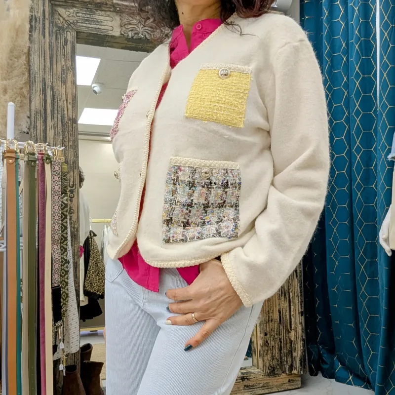 Pour plus de praticité, le gilet est doté de deux petites poches plates au niveau de la poitrine. Ces poches, réalisées dans des matières et coloris différents, sont ornées d’un bouton doré, ajoutant une touche d’originalité. Plus bas, vous trouverez deux poches plates plus grandes, également en couleurs variées, enrichies de filaments dorés qui scintillent subtilement à la lumière. Ces éléments ne sont pas seulement esthétiques, ils offrent également une fonctionnalité indispensable pour garder vos petits objets à portée de main.