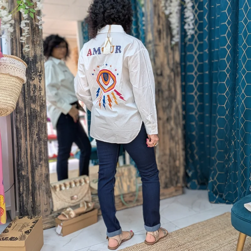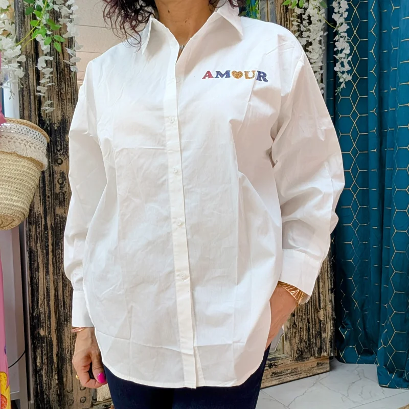 La chemise est un élément essentiel de toute garde-robe, et notre modèle se distingue par son originalité et son élégance. Disponible en blanc ou en chocolat, cette chemise attire l’attention avec son inscription colorée « AMOUR » placée sur le côté, juste au-dessus de la poitrine. Ce détail vibrant apporte une touche de dynamisme et de personnalité à la pièce, parfaite pour ceux qui souhaitent exprimer leur style unique.