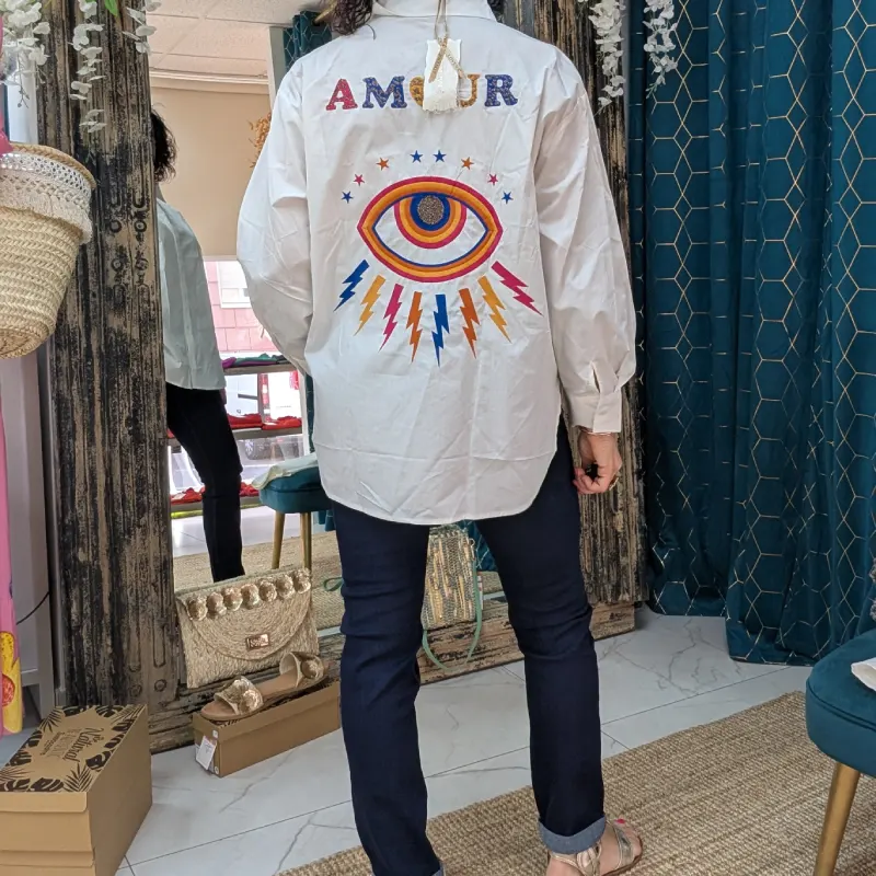 Au dos, le mot « AMOUR » est présenté en plus gros caractères, orné de filaments dorés qui ajoutent une note de sophistication. Ce contraste entre la couleur et la brillance des filaments crée un effet visuel captivant. En complément, un œil stylisé et des éclairs de couleurs variées viennent enrichir le design, rendant la chemise encore plus attrayante et originale. Ces éléments graphiques font de cette chemise une pièce véritablement unique, idéale pour se démarquer.