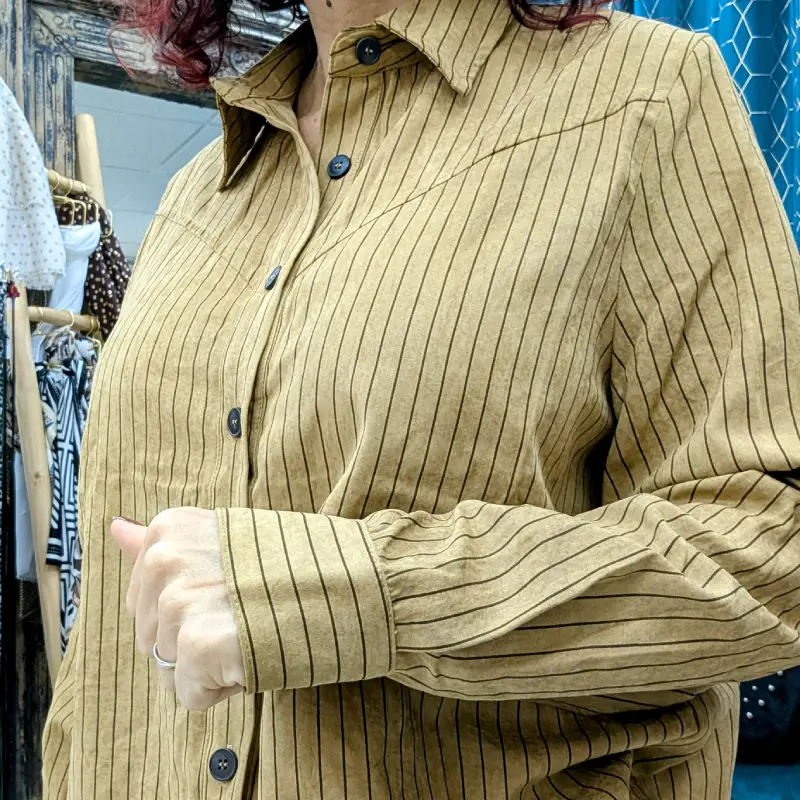 Découvrez notre chemise effet suédine, une pièce essentielle pour toute garde-robe moderne. Disponible dans des teintes élégantes de taupe, moutarde ou marron, cette chemise est ornée de fines rayures marron foncé, ajoutant une touche de sophistication à votre look. Sa texture douce et confortable fait de cette chemise un choix parfait pour toutes les occasions, que ce soit pour le travail ou une sortie décontractée.