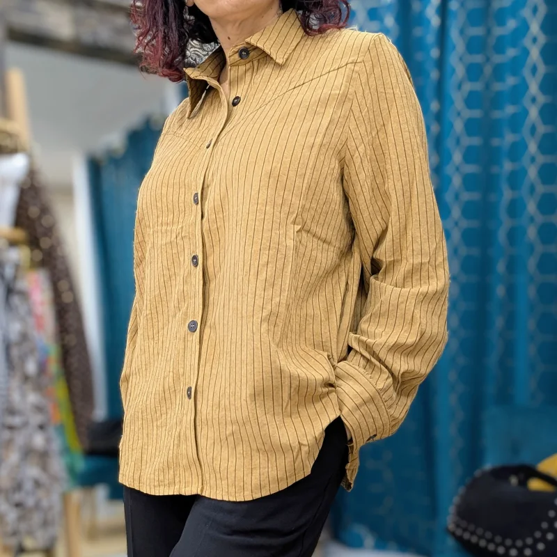 Que vous souhaitiez un look décontracté ou plus habillé, cette chemise est extrêmement polyvalente. Elle peut être portée avec un jean pour un style casual ou associée à une jupe pour une tenue plus chic. Les couleurs taupe, moutarde et marron se marient facilement avec d’autres pièces de votre garde-robe, vous permettant de créer une multitude de looks différents.