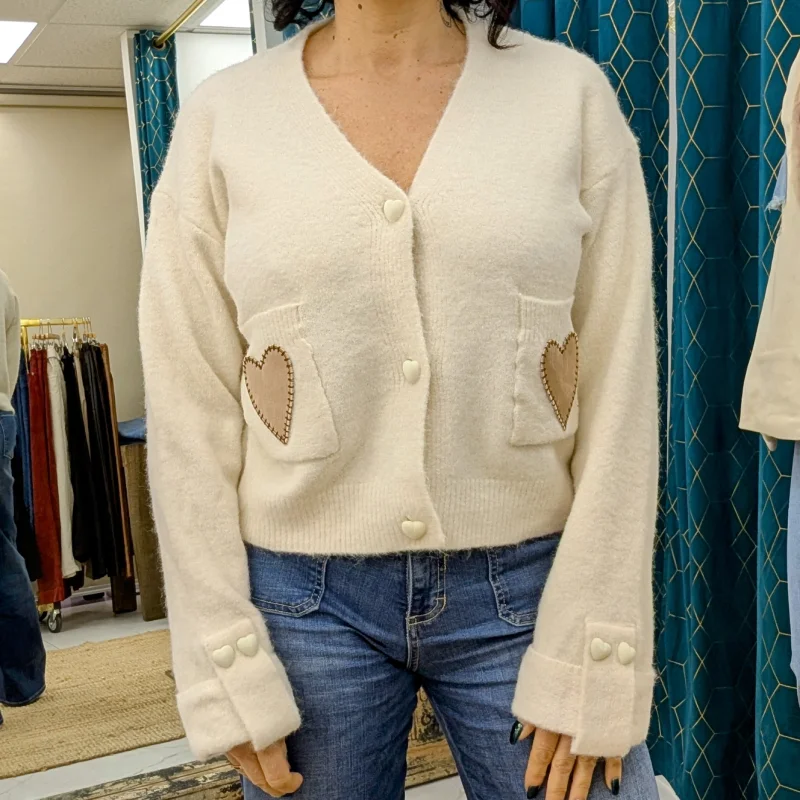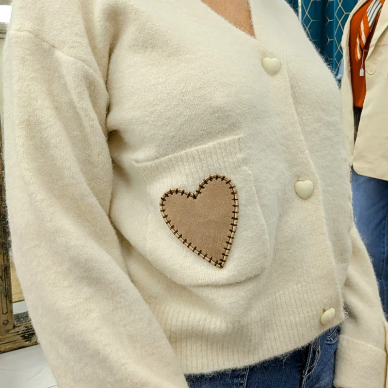 Le gilet est équipé de deux poches plates, ornées d’un gros cœur de couleur camel. Ces poches ne sont pas seulement pratiques pour y glisser vos petites affaires, mais elles ajoutent également un élément décoratif qui attire l’œil. Le contraste entre le beige du gilet et le camel des cœurs crée une harmonie visuelle agréable, rendant ce gilet encore plus attrayant.