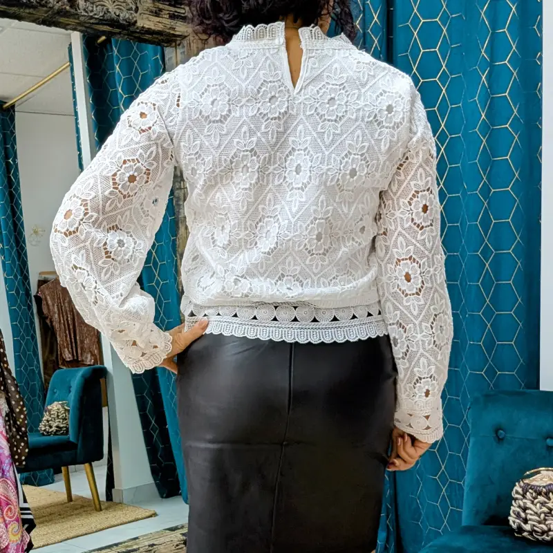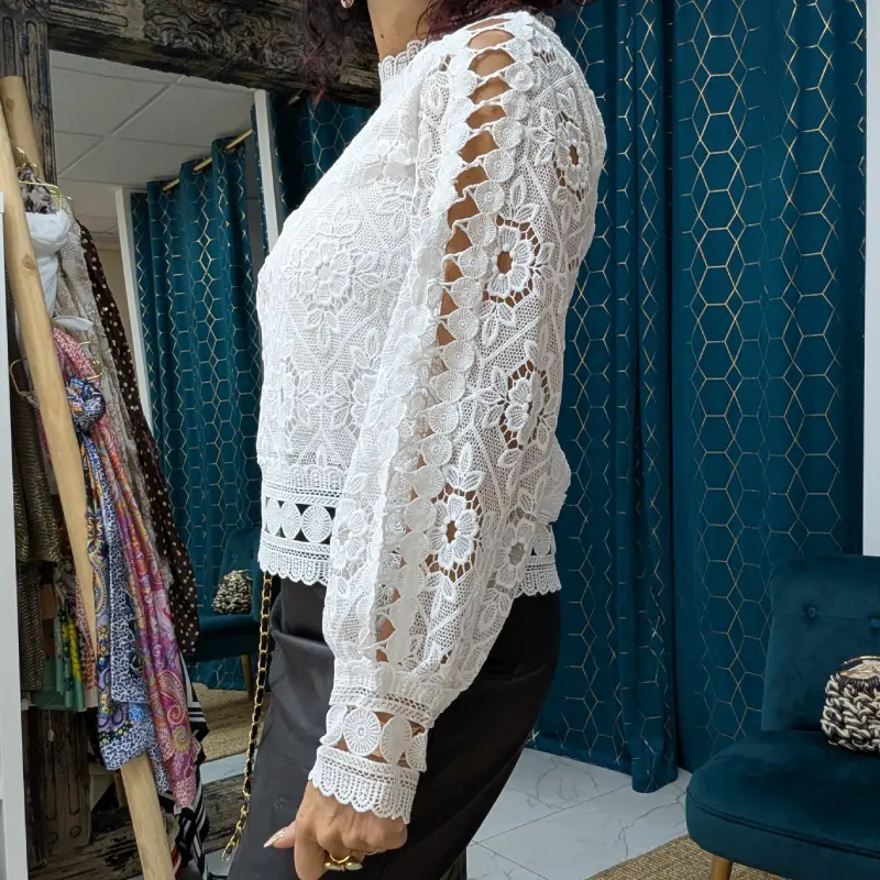 Le premier modèle est un haut blanc à coupe droite, légèrement court, qui se distingue par ses manches bouffantes et resserrées, entièrement ornées de délicates broderies. Ce haut est conçu avec un col rond qui se ferme par un bouton à l’arrière de la nuque, ajoutant une touche de sophistication. Bien que les manches ne soient pas doublées, le buste est soigneusement doublé pour un confort optimal. Ce modèle est parfait pour une sortie décontractée ou une occasion spéciale, offrant une allure romantique et chic à la fois.