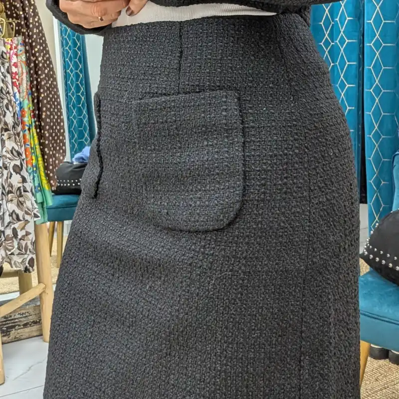 La jupe se ferme par un zip à l’arrière, assurant un enfilage facile et un ajustement parfait. Ce détail fonctionnel contribue également à l’esthétique épurée de la pièce, permettant de mettre en avant le tissu texturé du tweed. Le noir intemporel de cette jupe en fait un incontournable, facile à associer avec une variété de hauts, des chemisiers aux t-shirts décontractés.