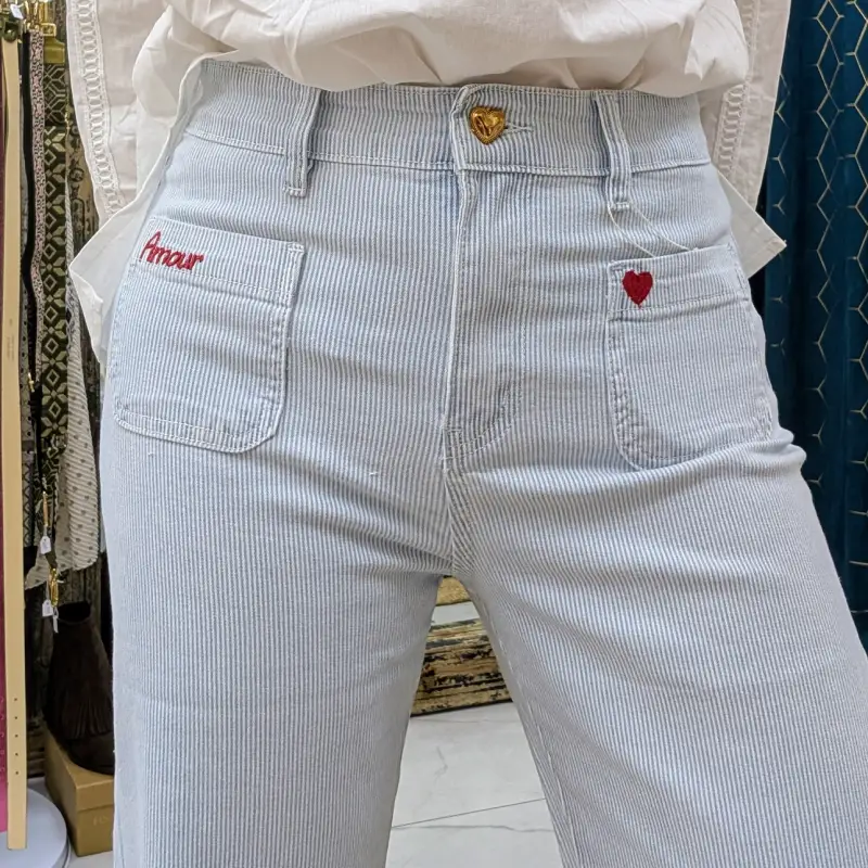 Ce deuxième modèle présente des fines rayures blanches et bleu ciel, parfait pour un look frais et estival. La fermeture se fait par un zip suivi d’un bouton en forme de cœur, ajoutant une touche ludique et romantique. Les poches plates à l’avant sont ornées d’un petit cœur rouge et de l’inscription « amour », apportant une note de fantaisie. Ce pantalon est idéal pour une sortie entre amis ou une journée de détente.