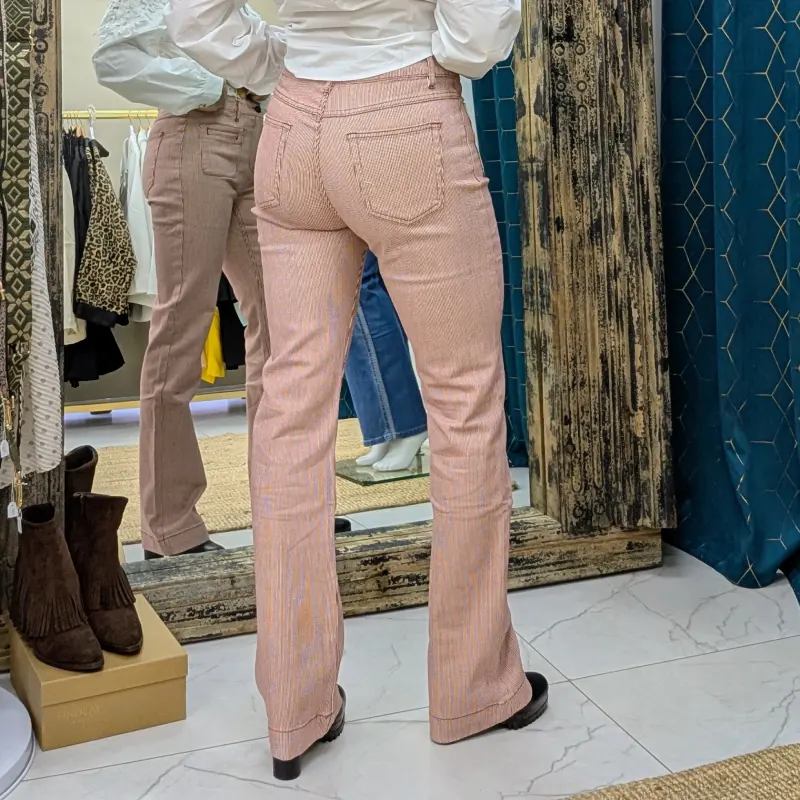 Ce pantalon se distingue par ses fines rayures rouges et beiges, ajoutant une touche de sophistication à votre tenue. Il est équipé de poches plates à l’avant et à l’arrière, offrant à la fois un style élégant et une fonctionnalité pratique. La fermeture se fait par un bouton et un zip, garantissant un ajustement parfait. Ce modèle est idéal pour une journée au bureau ou une sortie décontractée. - Pantalon à Rayures Blanches et Bleu Ciel