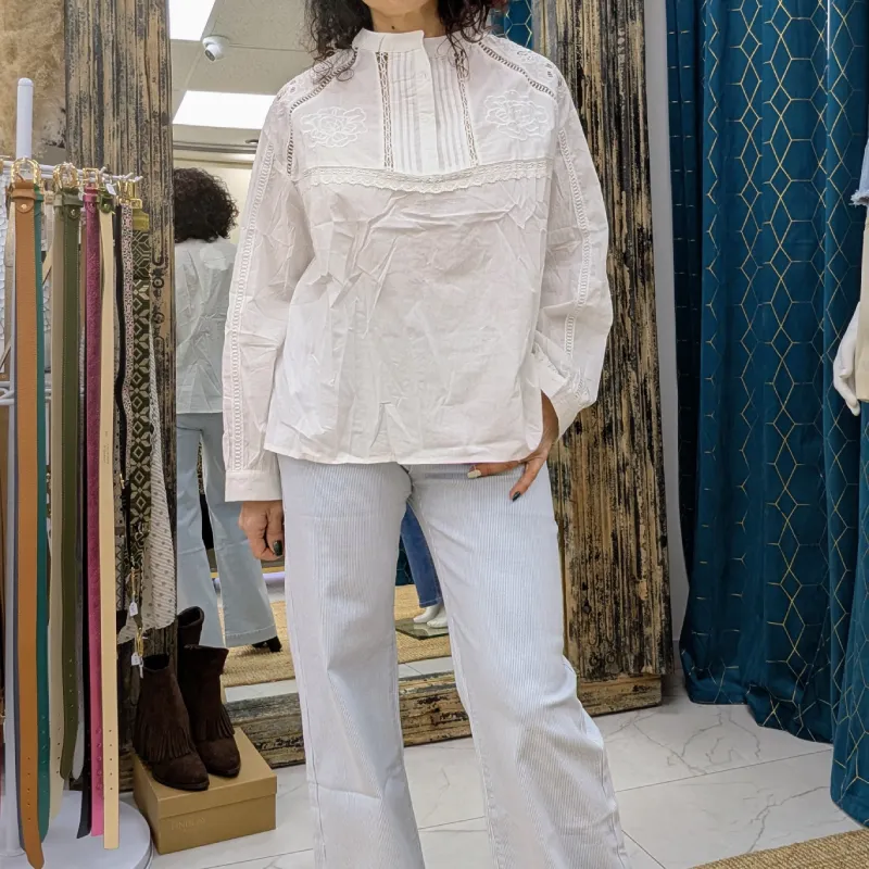 Cette tunique se distingue par sa broderie délicate et sa dentelle raffinée, ajoutant une touche de sophistication à votre look. Le col rond, agrémenté de quatre boutons de fermeture, apporte une note classique tout en facilitant l’enfilage. La coupe droite de la tunique assure un style intemporel qui convient à toutes les morphologies.