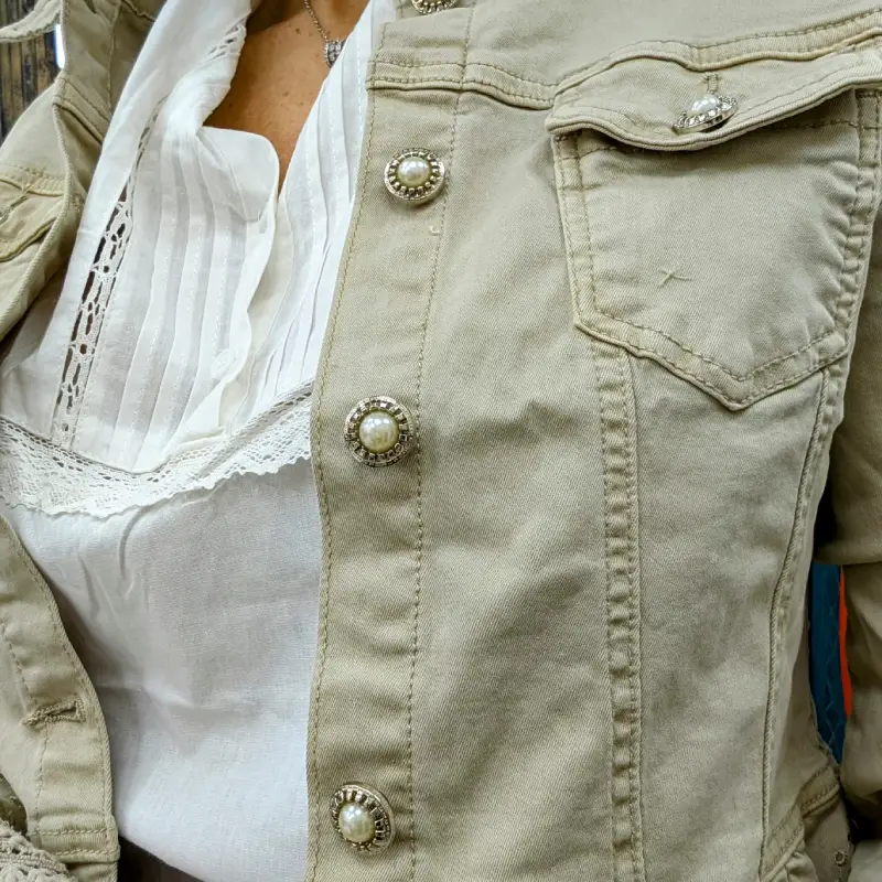 Cette veste se distingue par ses boutonnières ornées de jolis boutons avec strass et perles, ajoutant une touche de glamour à un look décontracté. Les deux poches plates, également dotées des mêmes boutonnières, offrent une fonctionnalité pratique tout en maintenant l’harmonie du design. Chaque détail a été soigneusement pensé pour allier esthétique et utilité.