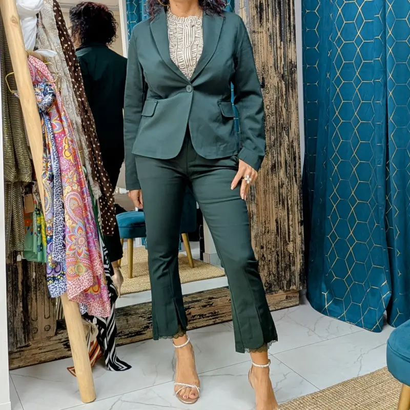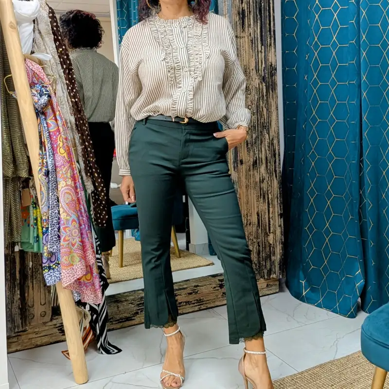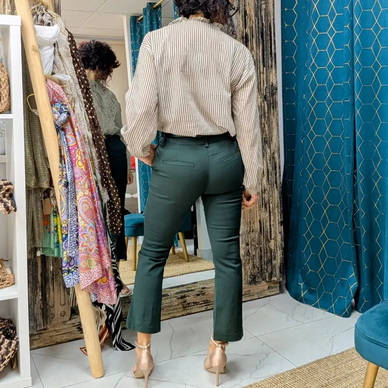 Découvrez notre pantalon habillé de couleur vert sapin, un incontournable pour toutes les occasions où l’élégance rencontre le confort. Sa coupe droite légèrement évasée sur le bas des jambes offre une silhouette raffinée tout en permettant une liberté de mouvement optimale. Avec une fente sur le devant d’environ 10 cm, ce pantalon ajoute une touche de sophistication à votre tenue, tout en mettant en valeur vos chaussures.