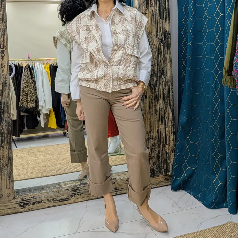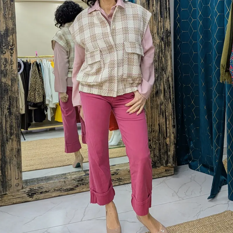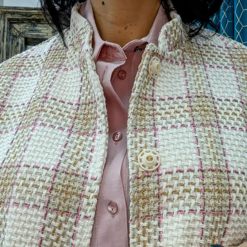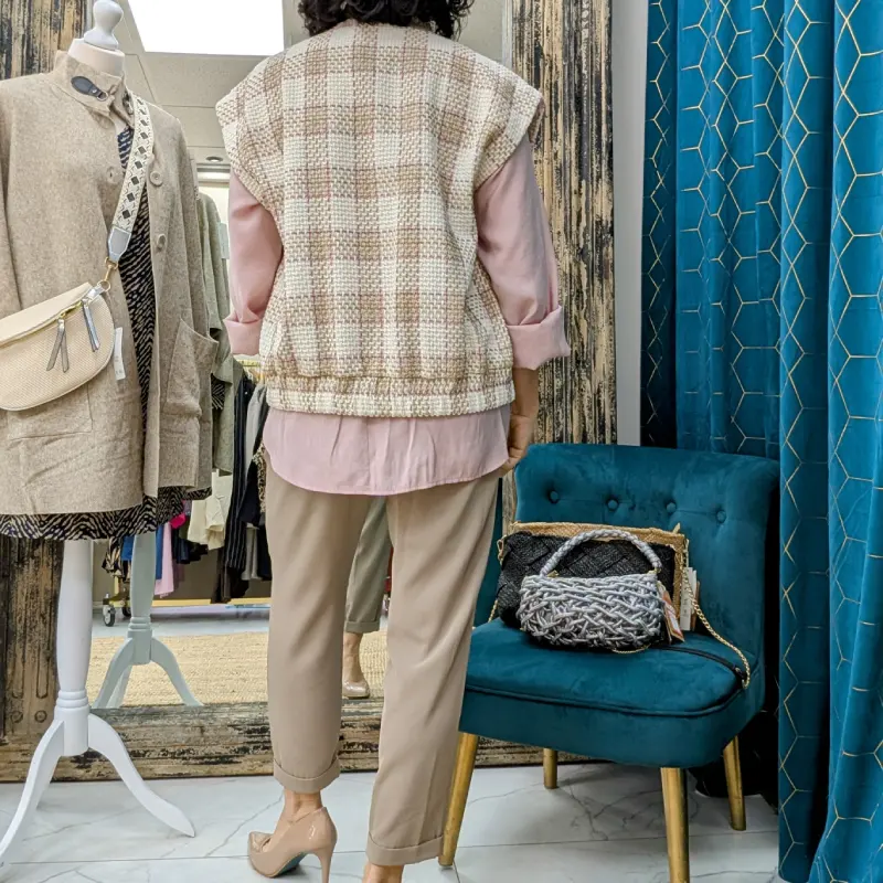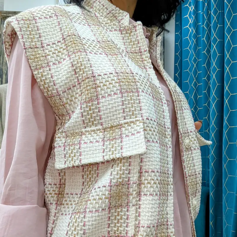 Le blouson sans manches de la marque italienne Please est une pièce à la fois tendance et pratique, idéale pour les saisons intermédiaires. Fabriqué dans le même tweed de qualité, il présente un design élégant avec un motif de carrés blancs entourés de liserés roses, ainsi que des carrés en couleur taupe. Ce blouson est parfait pour ajouter une touche de sophistication à n’importe quelle tenue.