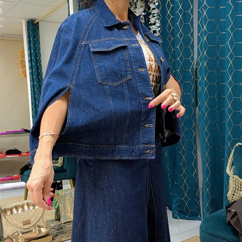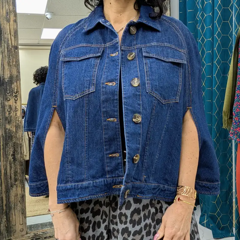 Découvrez la veste en jean cape bleu brut de la marque italienne « PLEASE », un vêtement audacieux qui allie style contemporain et confort. Avec sa forme unique en triangle, cette veste se distingue par son design innovant et ses fentes latérales qui permettent de passer facilement les bras, offrant ainsi une grande liberté de mouvement tout en conservant une allure chic et décontractée.