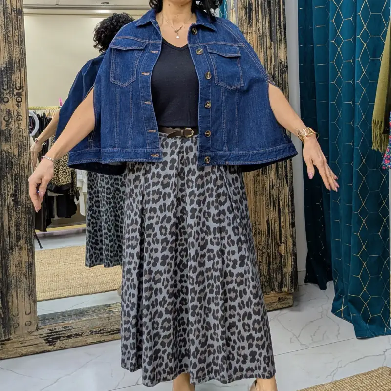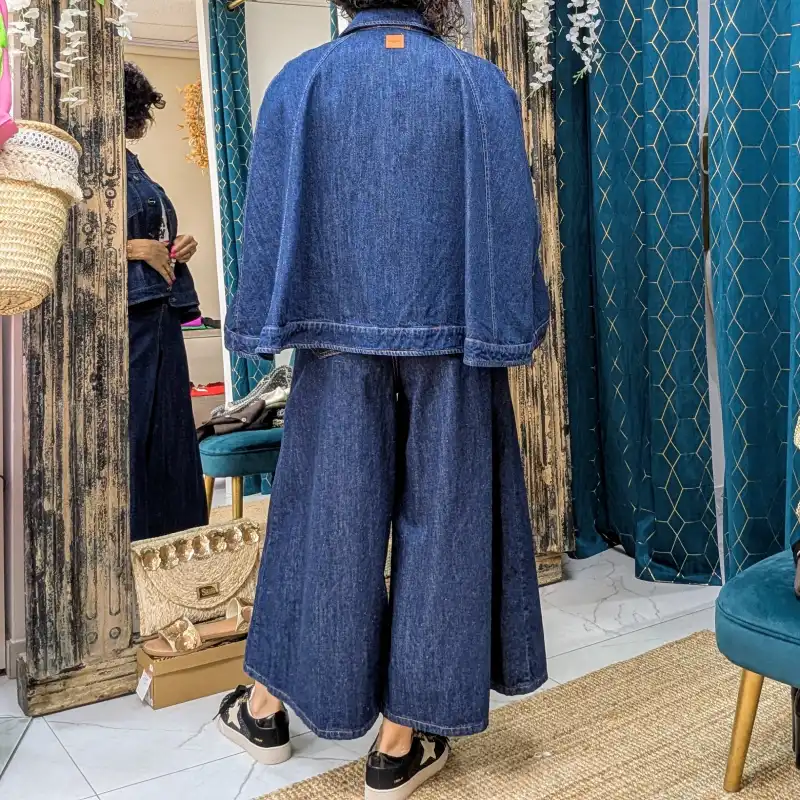 La veste en jean cape se caractérise par son assemblage soigné avec plusieurs empiècements, ce qui lui confère une texture et un style distinctifs. Les deux poches plates à rabat ajoutent une touche pratique tout en préservant l’esthétique générale de la pièce. Que ce soit pour ranger vos petits objets ou simplement pour le style, ces poches sont à la fois fonctionnelles et élégantes.