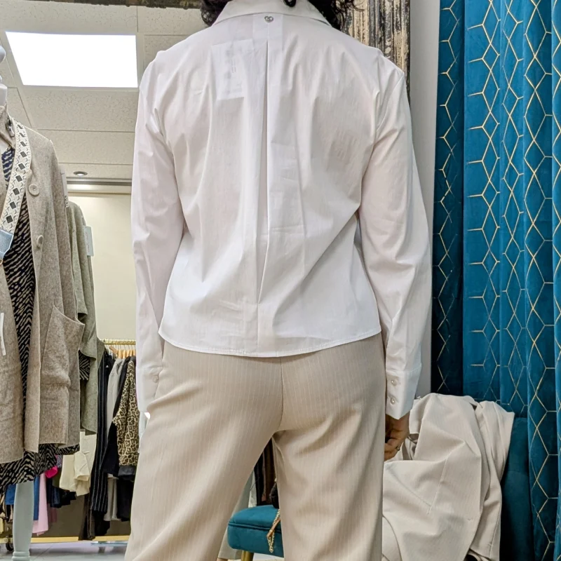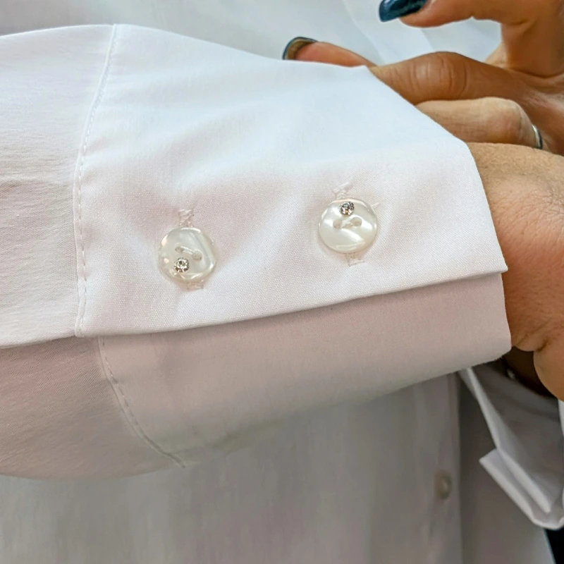 Un des éléments marquants de cette chemise est la pince située dans le dos, fermée en haut et en bas. Ce détail non seulement améliore la coupe, mais ajoute également une touche de finesse à l’ensemble. Les manches longues, évasées à la base, sont une autre caractéristique qui fait toute la différence. Elles sont fermées par deux petits boutons, embellis d’un petit strass, ajoutant une note de brillance subtile. Ce détail délicat souligne le savoir-faire italien et la qualité de la confection.