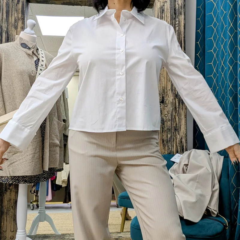 La chemise PLEASE est extrêmement polyvalente. Elle peut être portée de manière décontractée avec un jean et des baskets pour un look quotidien, ou bien associée à un pantalon chic et des talons pour une allure plus habillée. Son design intemporel et sa couleur neutre en font une pièce essentielle de votre garde-robe.