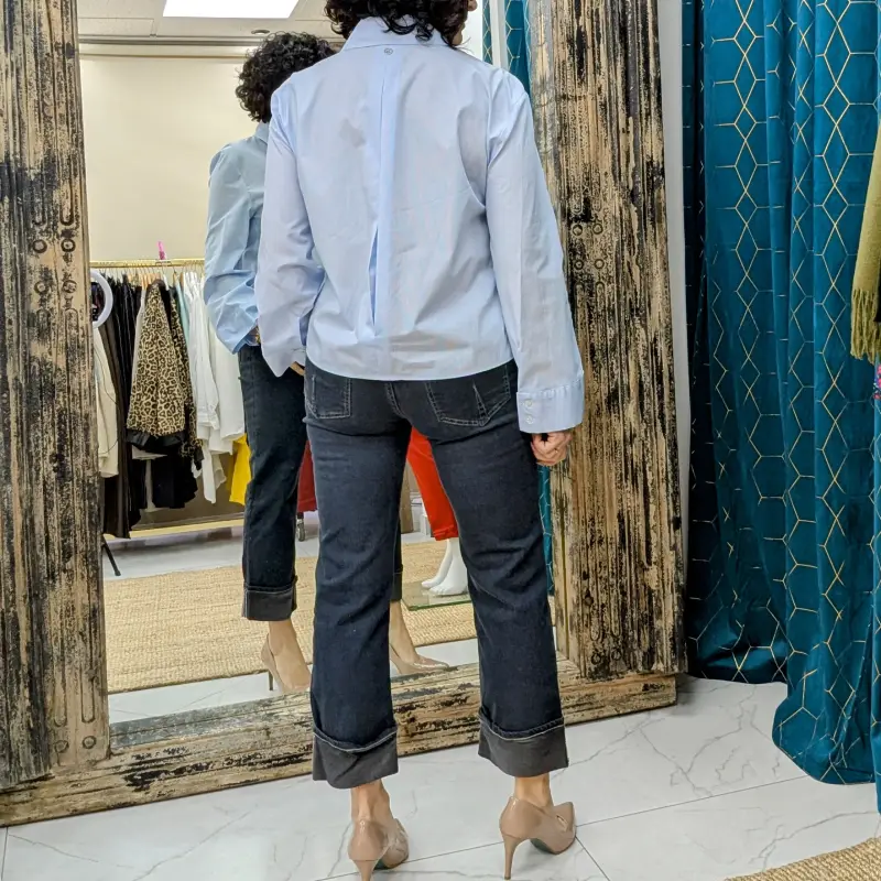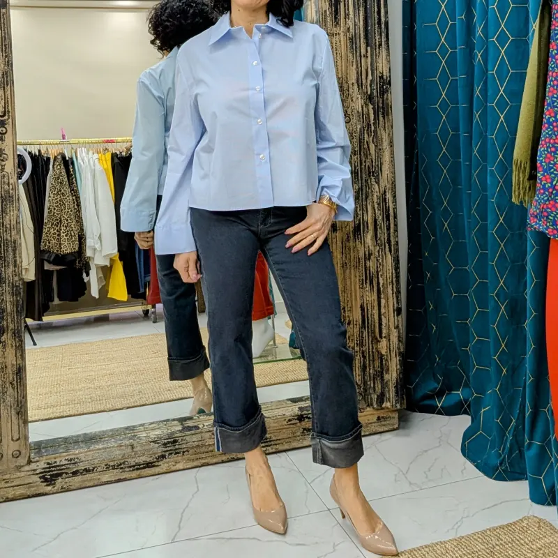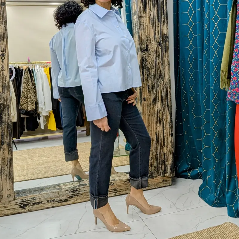 Un des éléments marquants de cette chemise est la pince située dans le dos, fermée en haut et en bas. Ce détail non seulement améliore la coupe, mais ajoute également une touche de finesse à l’ensemble. Les manches longues, évasées à la base, sont une autre caractéristique qui fait toute la différence. Elles sont fermées par deux petits boutons, embellis d’un petit strass, ajoutant une note de brillance subtile. Ce détail délicat souligne le savoir-faire italien et la qualité de la confection.