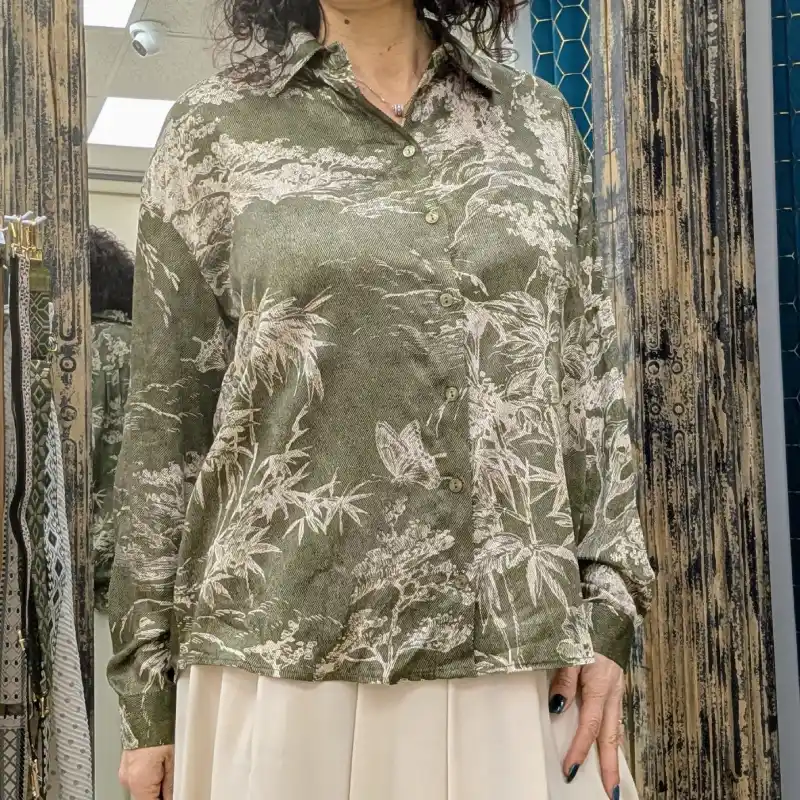 La couleur kaki de la chemise évoque une connexion avec la nature, tandis que les imprimés d’arbres et de papillons en beige clair apportent une note douce et poétique. Ces motifs inspirés de la nature sont non seulement esthétiques, mais ils reflètent également un engagement envers un style de vie respectueux de l’environnement. En portant cette chemise, vous faites le choix d’un vêtement qui célèbre la beauté de la nature tout en restant à la pointe de la mode.