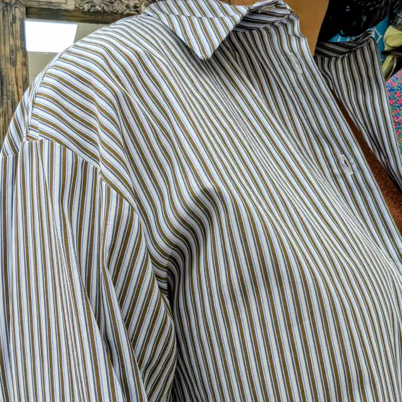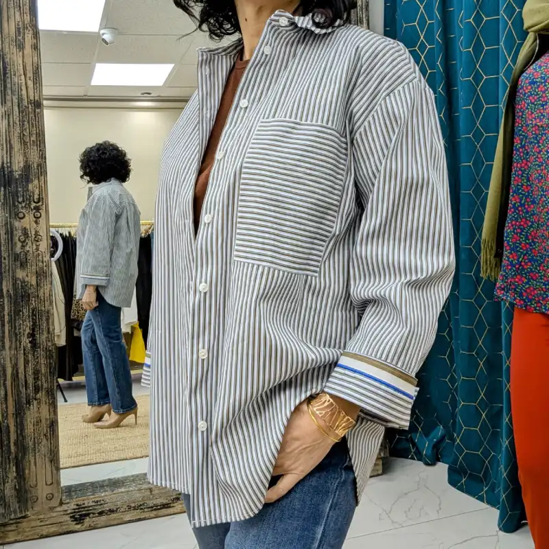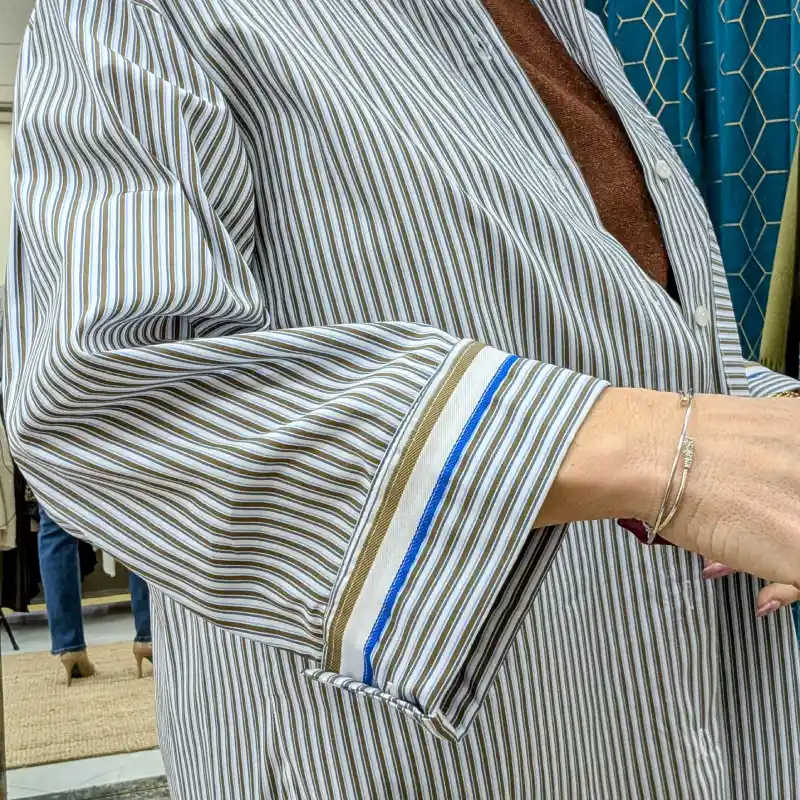 La chemise PLEASE se distingue par son motif à rayures sophistiqué, mêlant des teintes de marron, bleu foncé et bleu clair sur un fond blanc éclatant. Ce choix de couleurs apporte une touche de modernité tout en restant intemporel. Les rayures verticales allongent la silhouette, ce qui est parfait pour un look élégant et raffiné.