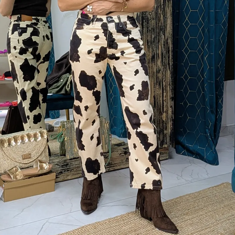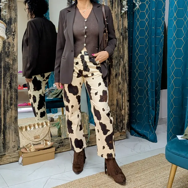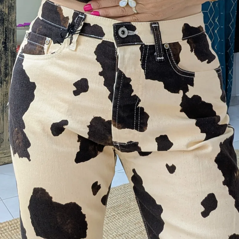 Ce qui rend ce jean vraiment original, c’est son imprimé vache sur un fond de couleur crème. Ce motif audacieux et contemporain attire l’œil et se démarque des jeans traditionnels. Que vous souhaitiez faire une déclaration de style ou simplement ajouter une pièce unique à votre collection, ce jean est le choix parfait. Il peut être associé à un t-shirt basique pour un look décontracté ou à une blouse élégante pour une sortie en soirée.