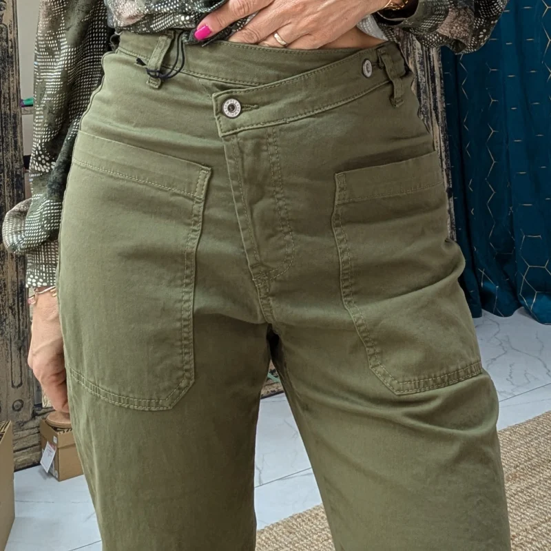 Un des atouts majeurs de ces pantalons vintage est la présence de grandes poches plaquées à l’avant, qui offrent non seulement une fonctionnalité pratique, mais aussi un style unique. Ces poches ajoutent une dimension visuelle intéressante et permettent de garder vos essentiels à portée de main. La fermeture croisée à double boutons apparent assure un maintien parfait et un ajustement personnalisé, tout en ajoutant une touche d’originalité au design.