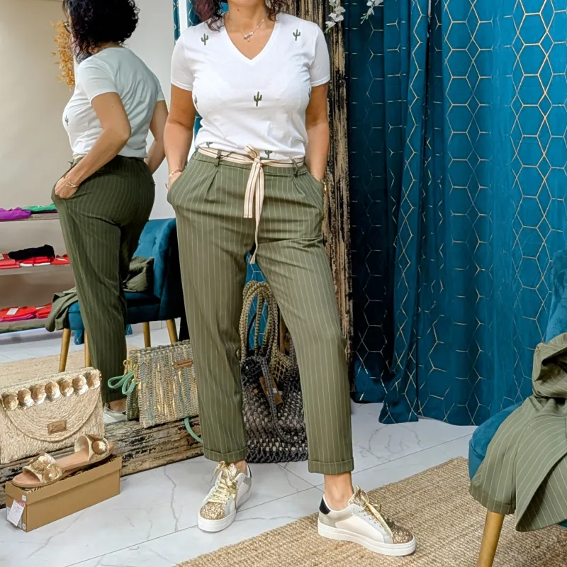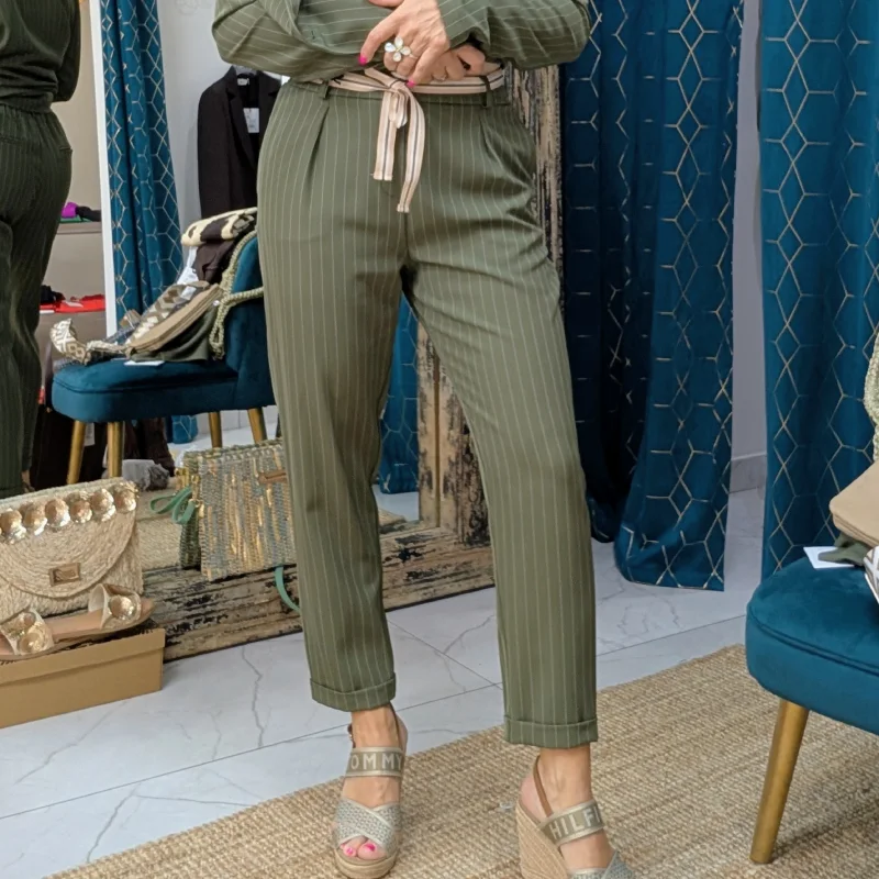 Ce modèle se décline dans une teinte tendance de vert olive, rehaussée de rayures blanches qui ajoutent une note de sophistication. Fabriqué à partir d’un mélange de 93% polyester, 5% élasthanne et 2% viscose, ce pantalon est non seulement résistant, mais il offre également une excellente élasticité, vous permettant de bouger avec aisance. La fausse empiècement pour braguette contribue à son allure moderne et épurée, tout en maintenant un style classique.