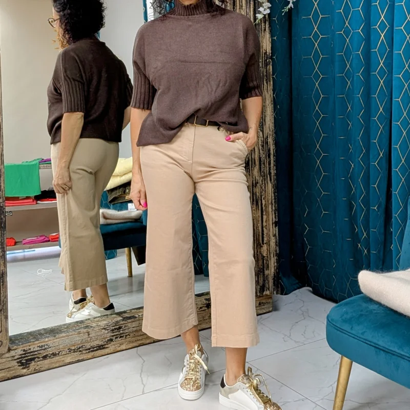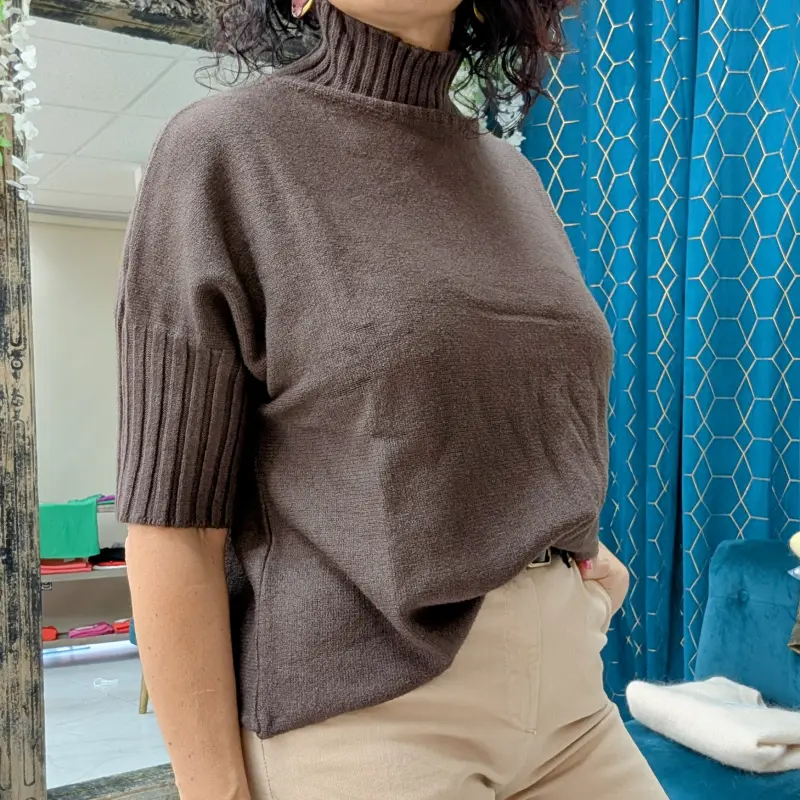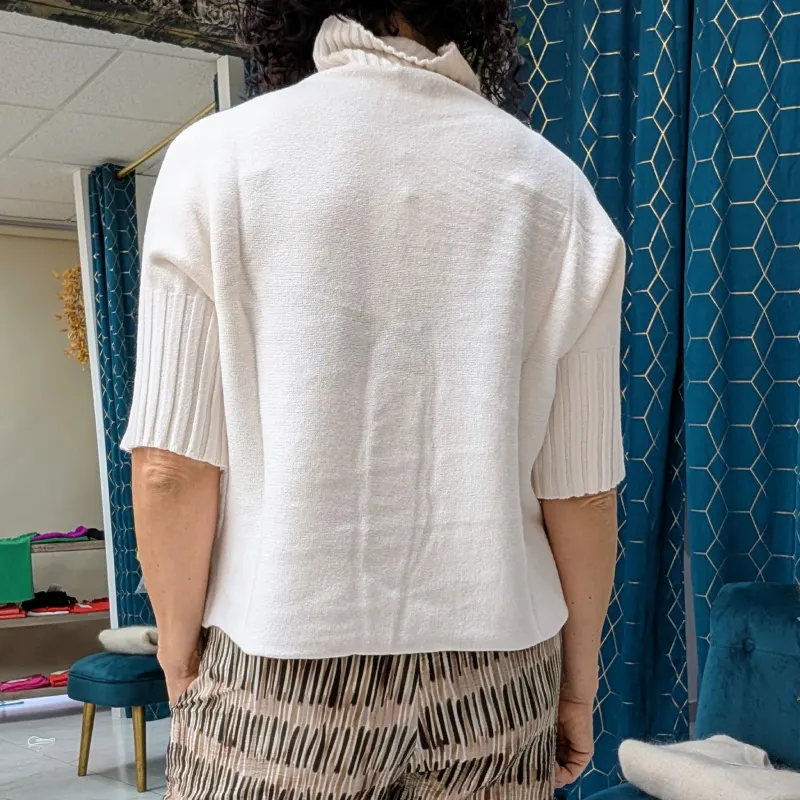 Ce pull se distingue par sa coupe courte et large, offrant une silhouette décontractée et moderne. Les manches 3/4 ajoutent une touche unique, avec un tricot différent en grosse maille. Cette conception permet d’obtenir un effet texturé qui apporte du caractère à la pièce. Les manches sont resserrées à la fin, créant un joli contraste avec le reste du pull, tout en ajoutant une dimension visuelle intéressante.