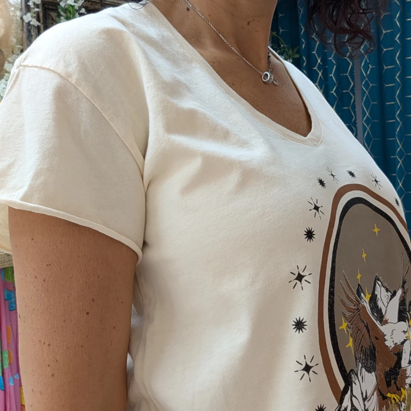 Sur le devant, un imprimé captivant attire immédiatement l’attention. Au centre, un demis cercle dans des tons taupe est entouré d’une bordure noire, suivi d’un anneau marron. À l’intérieur de ce cercle, des montagnes en noir et blanc créent une ambiance naturelle et majestueuse. Pour compléter ce design, un aigle en plein vol, dans les tons marron et blanc, ajoute une dynamique sauvage et libre. En bas de l’imprimé, l’inscription en doré « FLY HIGH » inspire à la fois l’aventure et la liberté, renforçant le message de ce t-shirt.