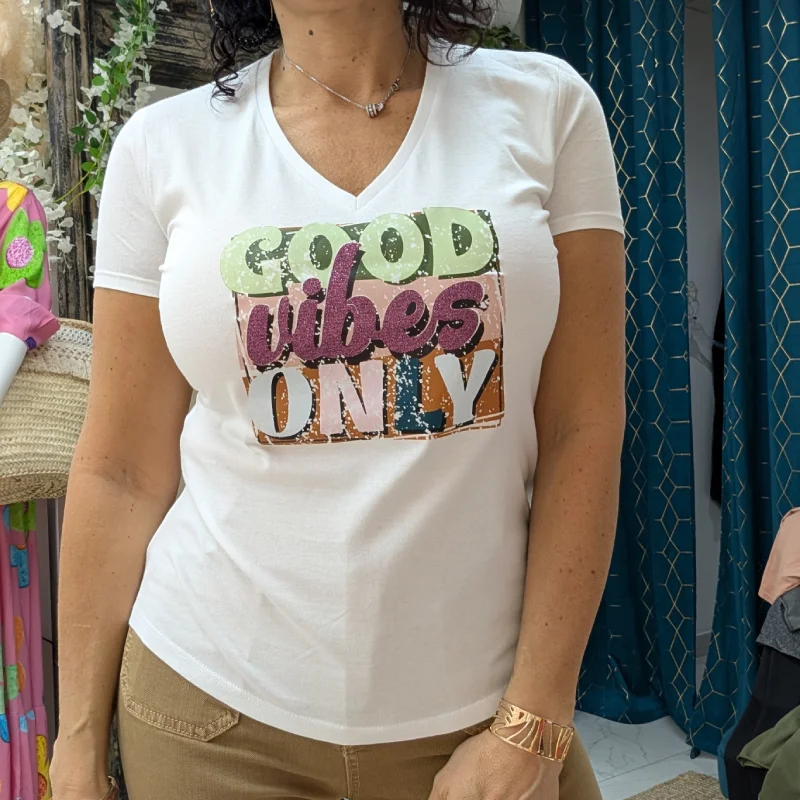 Le design met en avant un carré coloré, où chaque ligne d’inscription apporte une touche unique. La première ligne, marquée « GOOD », est présentée dans des tons de vert clair sur un fond vert foncé, créant un contraste agréable à l’œil. La deuxième ligne, « VIBES », est écrite en bordeaux scintillant, avec des paillettes, sur un fond rose pâle, ajoutant une note festive et joyeuse. Enfin, la troisième ligne, « ONLY », présente trois lettres de couleurs différentes : bleu canard, rose pâle et bleu ciel, sur un fond moutarde qui attire l’attention. Ce mélange de couleurs et de textures fait de ce t-shirt une pièce dynamique et pleine de vie.