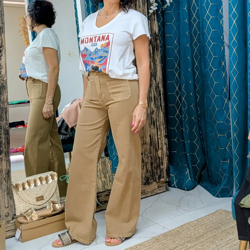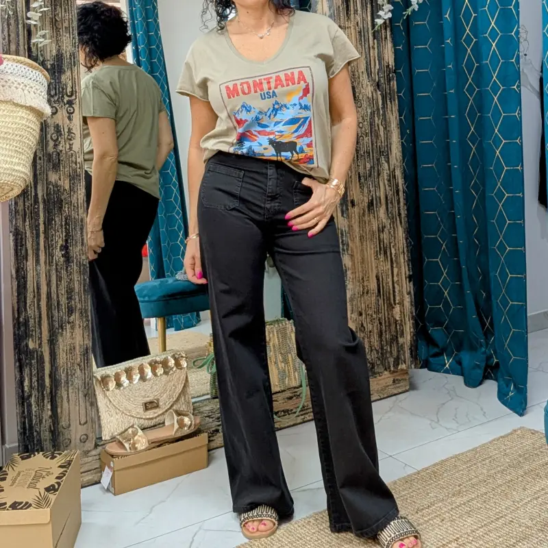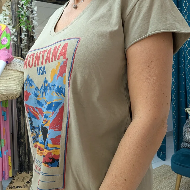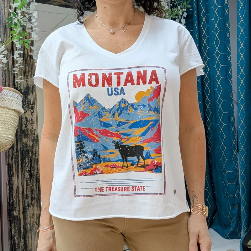 Sur le devant, vous trouverez un imprimé carré qui attire immédiatement l’attention. À l’intérieur de ce carré, le mot MONTANA est inscrit en rouge pailleté, apportant une touche de brillance. Juste en dessous, le terme USA est affiché en bleu, ajoutant un contraste intéressant. Pour compléter ce design, des montagnes dans des tons de bleu, jaune et rouge entourent l’imprimé, tandis qu’un élan noir majestueux se dresse fièrement, ajoutant une note sauvage et naturelle à l’ensemble.