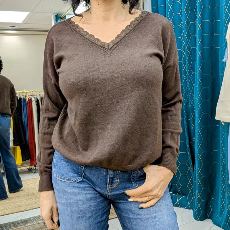 Découvrez notre pull basic encolure en V orné de dentelle : l’élégance au quotidien
