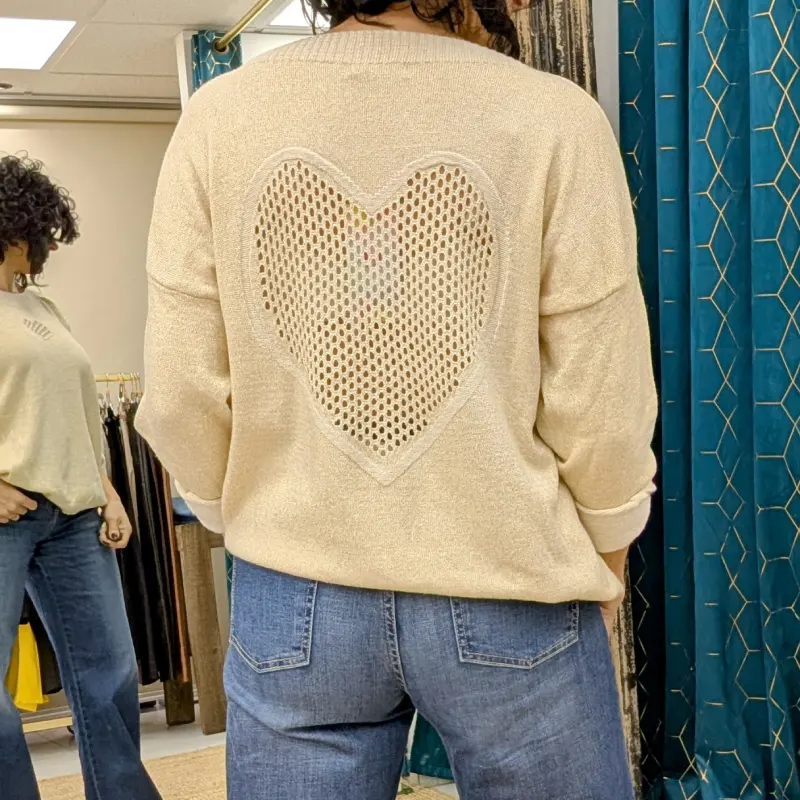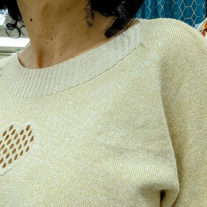 L’arrière du pull est orné d’un gros cœur en tricot, agrémenté de petits trous qui rappellent la technique du crochet. Ce détail ludique et romantique apporte une dimension unique à ce vêtement, le rendant parfait pour les occasions spéciales ou pour une sortie décontractée. À l’avant, un petit cœur est subtilement intégré au niveau du thorax, ajoutant une note délicate et raffinée qui saura séduire tous les regards.