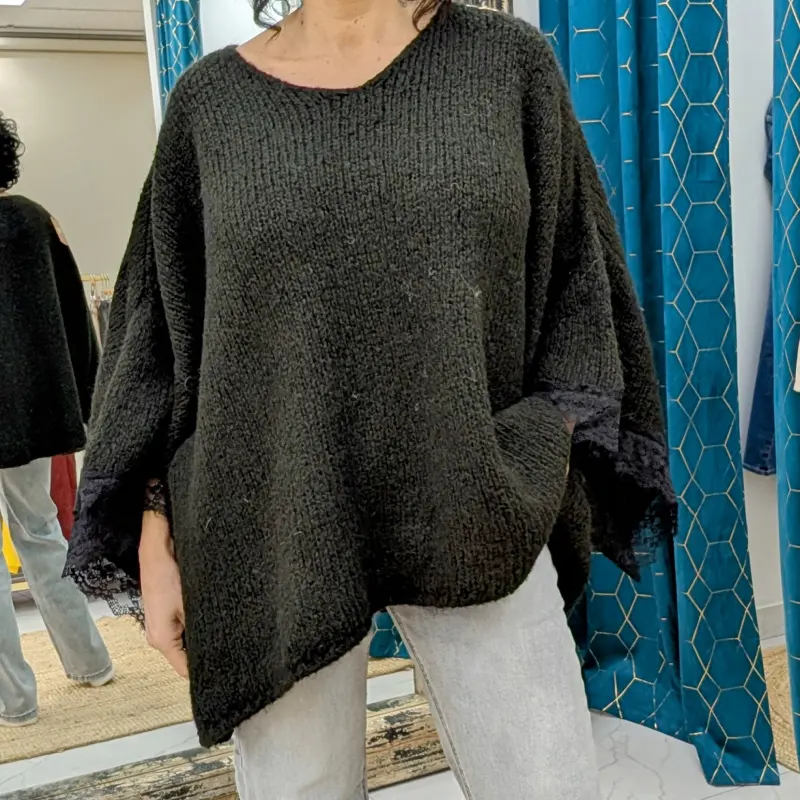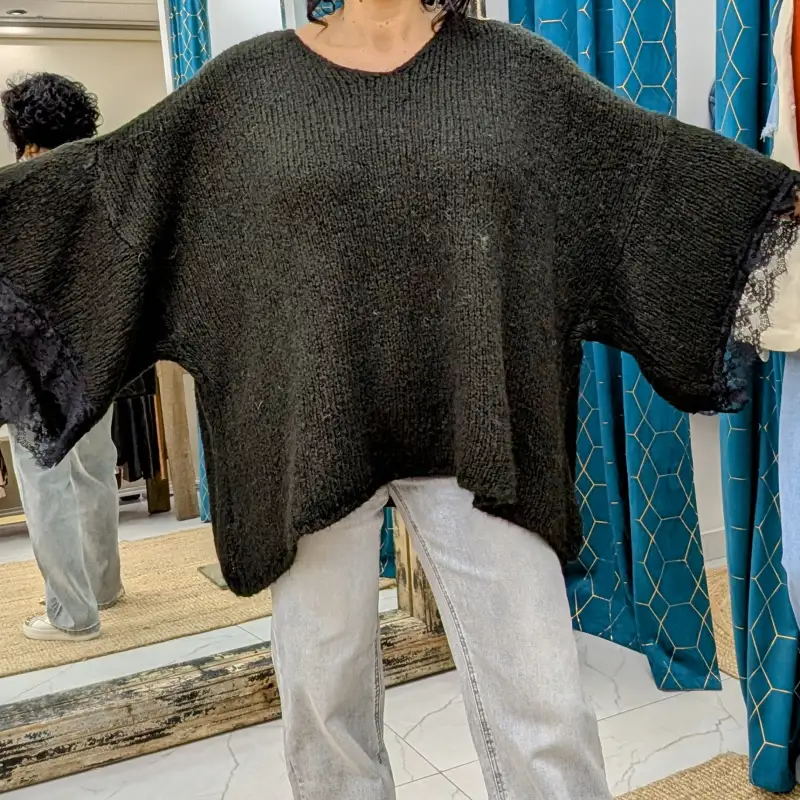 Ce pull se distingue par son col en V flatteur qui met en valeur le cou et le décolleté. L’emmanchure large offre un confort inégalé, permettant une grande liberté de mouvement. Les manches 3/4, légèrement évasées, ajoutent une touche de féminité et de sophistication. Le bout des manches est délicatement orné de dentelle, apportant une note romantique et élégante à l’ensemble.