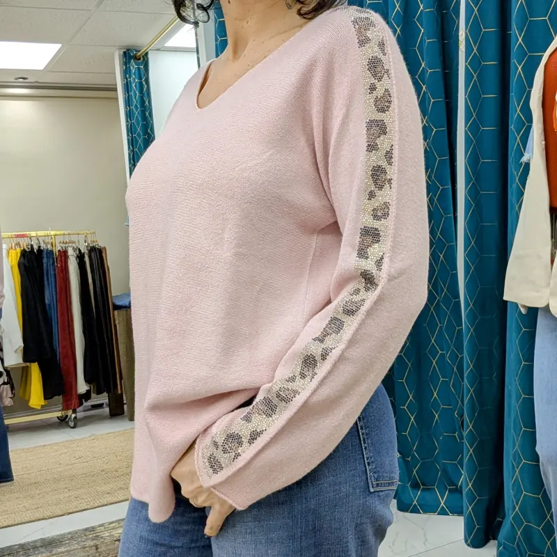 - Manches avec Bande en Strass : Pour une touche de glamour, ce pull est orné d’une bande en strass sur les manches. Ce détail scintillant attire l’œil et ajoute une dimension chic à votre tenue, parfait pour briller lors de vos soirées.