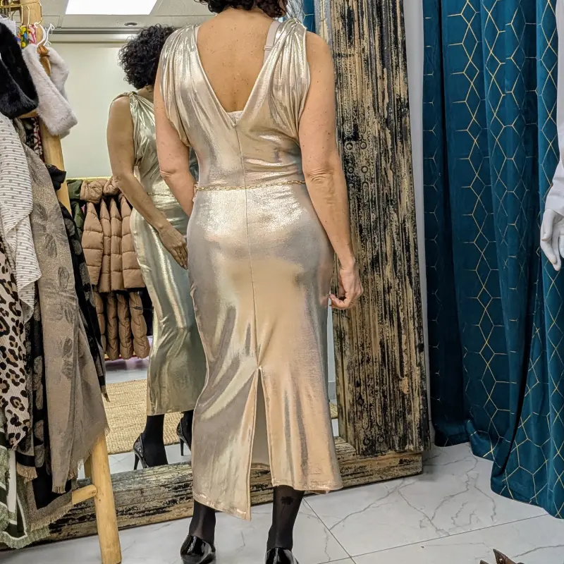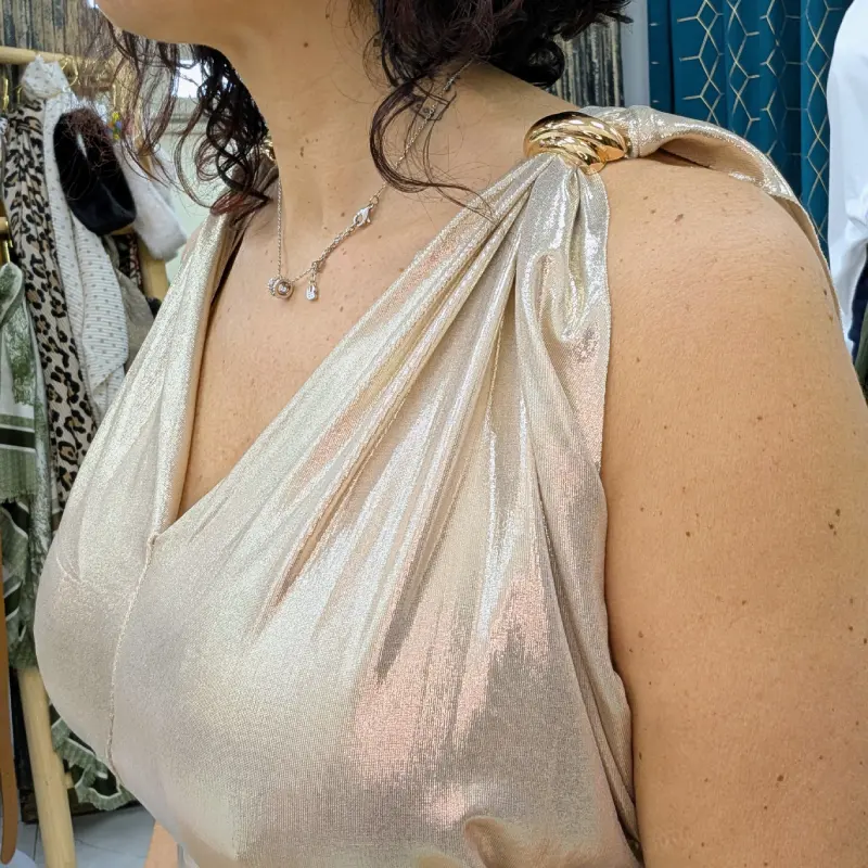 Que vous assistiez à un gala, une soirée entre amis ou un événement formel, cette robe longue dorée/nacrée est un choix parfait. Son design intemporel et ses détails raffinés en font une pièce polyvalente qui peut être accessoirisée de différentes manières. Associez-la à des escarpins dorés et à des bijoux délicats pour un look éblouissant, ou optez pour des sandales plus décontractées pour une allure chic mais décontractée.