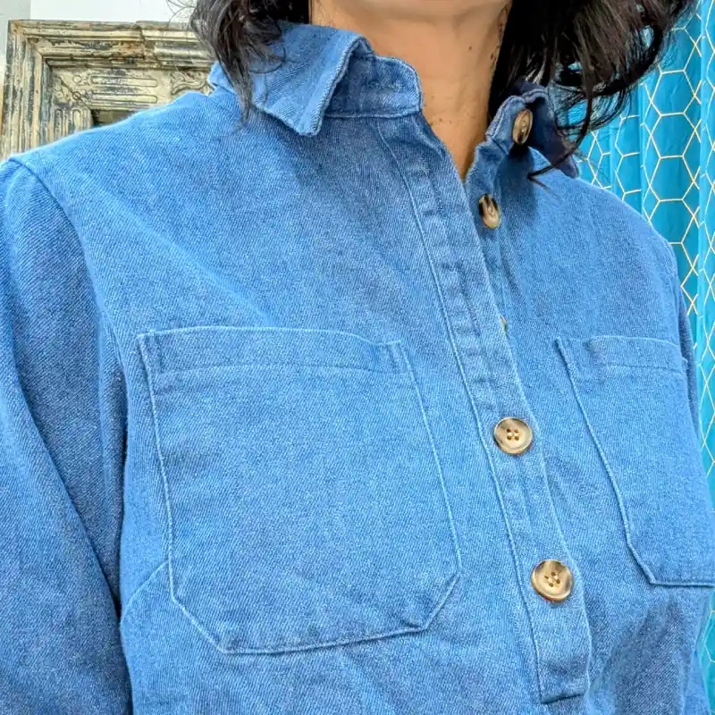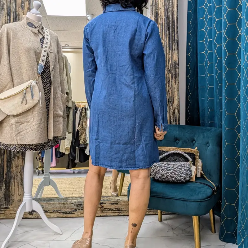 Découvrez notre robe en jean courte à manches longues, un incontournable de votre garde-robe. Confectionnée en 100% coton, cette robe allie confort et style, idéale pour toutes les occasions. Son design élégant comprend un col chemise classique orné de quatre boutons qui ajoutent une touche de sophistication.