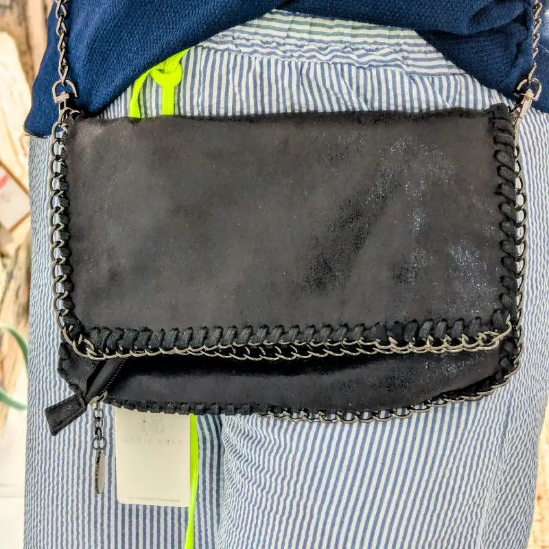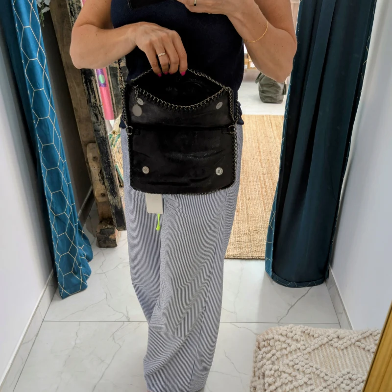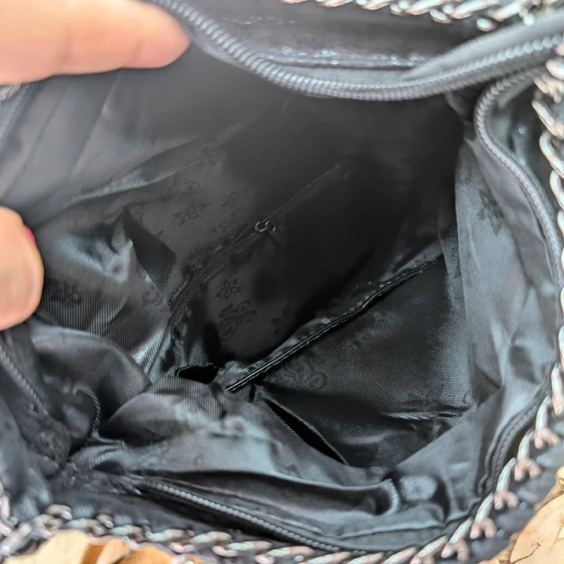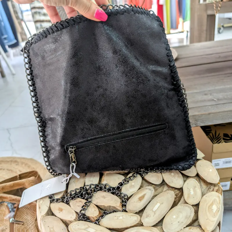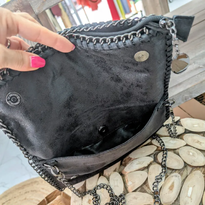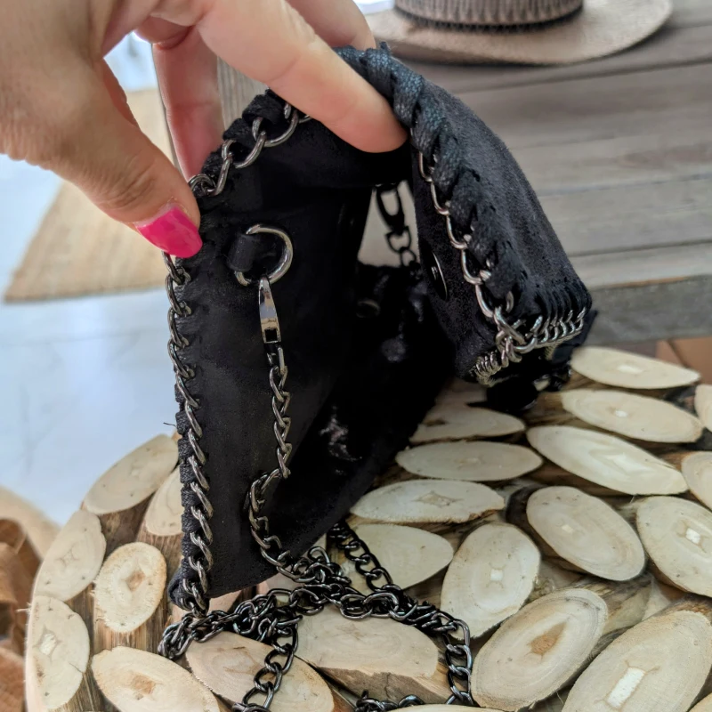 Ce sac se distingue par sa chainette en acier noir, qui est soigneusement cousue tout autour du sac et de la anse. Cette chaîne, d’une longueur maximale de 110 cm, est détachable, vous permettant de personnaliser votre look selon vos envies. Que vous préfériez le porter à l’épaule ou en bandoulière, ce sac s’adapte à votre style de vie.