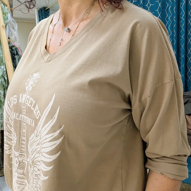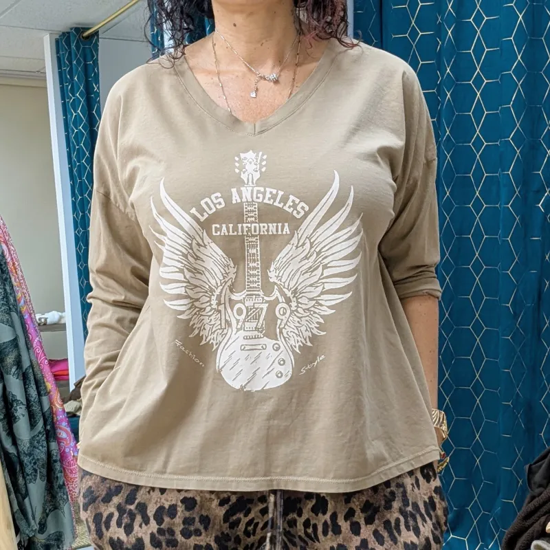 Découvrez notre t-shirt manches longues, un vêtement qui allie confort, style et originalité. Disponible en deux teintes élégantes, taupe et chocolat, ce t-shirt se distingue par son imprimé unique. Arborant une guitare stylisée accompagnée d’ailes d’oiseau, il affiche fièrement les inscriptions « Los Angeles » et « California » en couleur crème, ajoutant une touche artistique à votre tenue.
