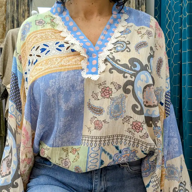 La tunique patchwork se marie parfaitement avec une variété de bas. Que vous optiez pour un jean décontracté, une jupe fluide ou un pantalon en lin, elle saura s’adapter à votre style. Les couleurs éclatantes du patchwork permettent également de l’associer facilement avec des accessoires colorés ou neutres, créant ainsi un look harmonieux et tendance.
