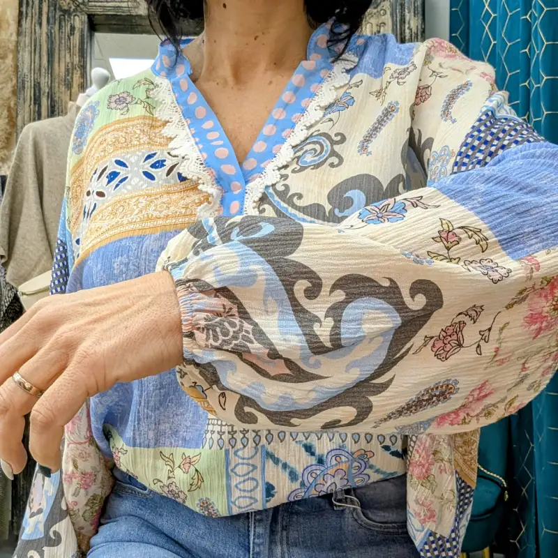 Les manches de la tunique sont élastiquées au niveau du bas, offrant ainsi un ajustement parfait et un confort optimal. Cette caractéristique permet également de jouer avec le style : vous pouvez porter les manches longues pour un look plus habillé ou les remonter pour une allure plus décontractée. Cette polyvalence fait de la tunique patchwork un choix idéal pour diverses occasions, que ce soit pour une journée au bureau, un brunch entre amis ou une sortie en soirée.
