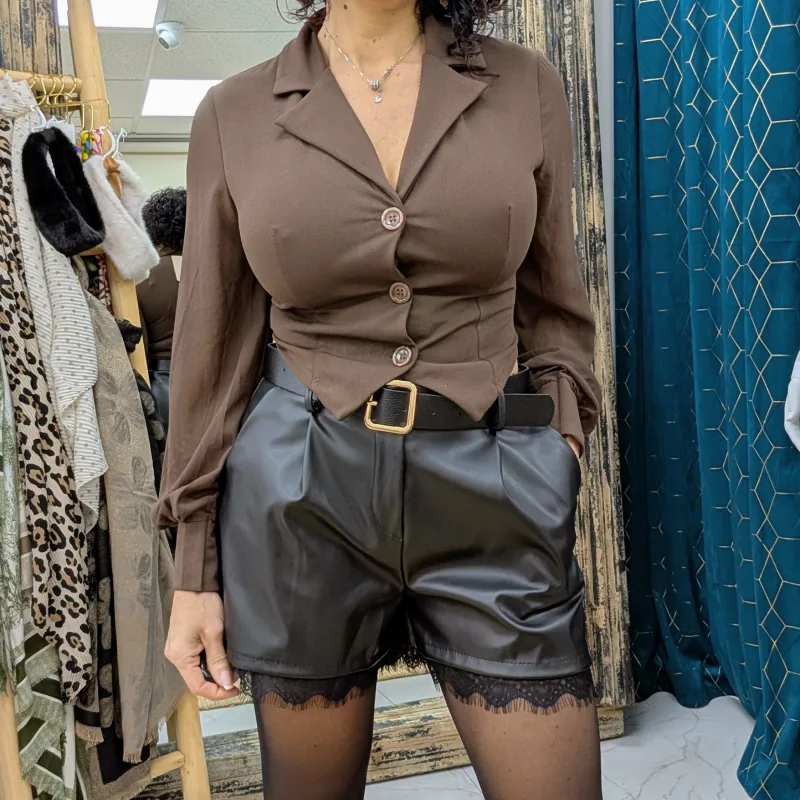 La veste courte est un essentiel de la garde-robe moderne, parfaite pour ajouter une touche sophistiquée à n’importe quelle tenue. Disponible en noir et marron, cette veste cintrée est conçue pour flatter toutes les silhouettes tout en offrant un confort optimal.
