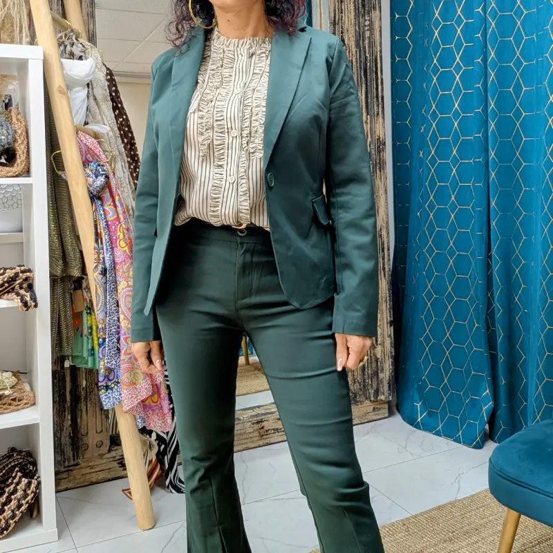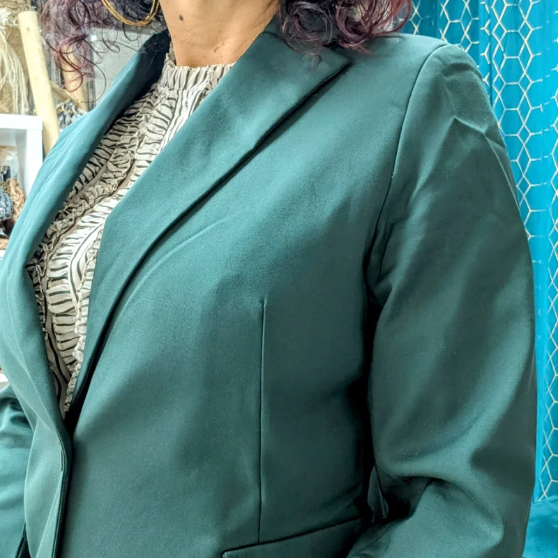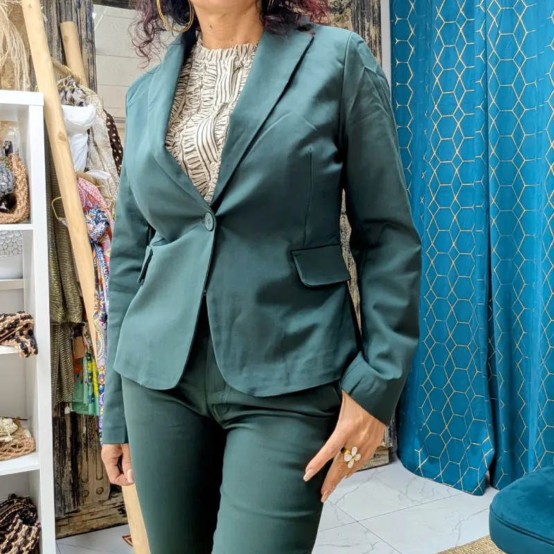 Cette veste de costume courte vert sapin est extrêmement polyvalente. Elle peut être portée avec un pantalon assorti pour un look complet et élégant ou associée à une jupe pour une touche féminine. Que ce soit pour une réunion au bureau, un dîner entre amis ou une soirée habillée, cette veste saura s’adapter à toutes les situations.