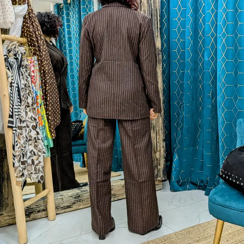 La veste tailleur marron avec des rayures crème est un choix idéal pour ceux qui recherchent à la fois style et confort pendant la saison froide. Sa coupe droite offre une silhouette moderne et élégante, tandis que les détails raffinés ajoutent une touche de sophistication. Ce blazer est parfait pour des occasions formelles ou des sorties décontractées, s’adaptant facilement à divers styles.