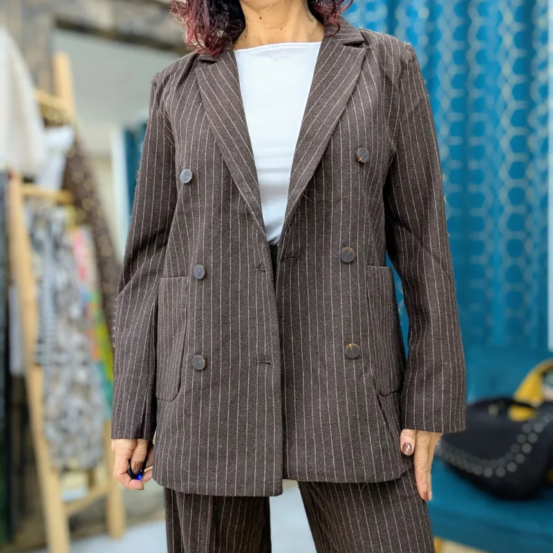 Veste Tailleur d’Hiver Marron à Rayures Crème : Élégance et Confort